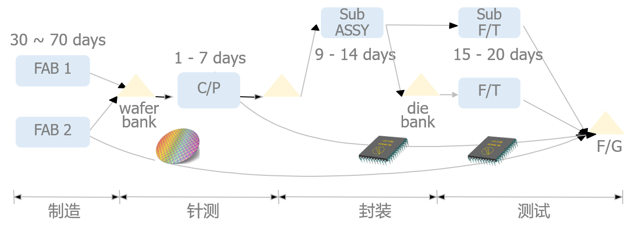 一般而言半导体制造过程繁琐、时间冗长,主要区分为Fab制造、CP针测、ASSY封装 和 FT测试